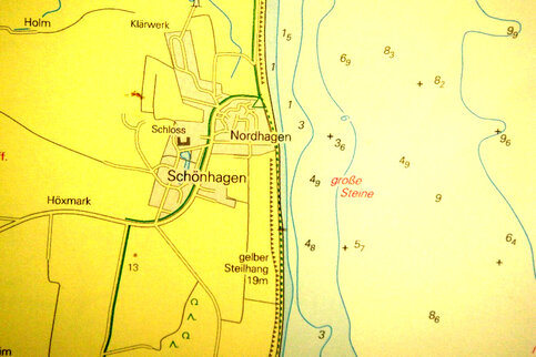 Telefonisch wird berichtet, dass gegen 12h30 4 bis 5 Schweinswale vor Schönhagen beobachtet wurden in etwa 100m Entfernung vom Strand. Die Beobachter saßen auf einer Bank am Beginn der Steilküste und konnten die Schweinswale mehrere Minuten lang verfolgen. Möglicherweise handelt es sich um zwei Mütter mit Nachwuchs auf der Suche nach Fisch. Die Seekarte gibt eine Wassertiefe von 4,8 Meter an und verzeichnet große Steine.