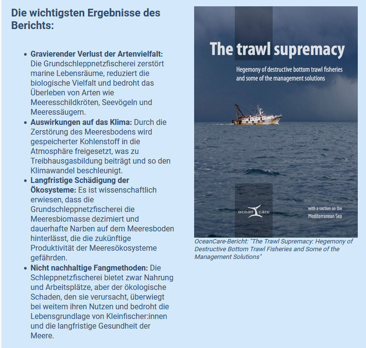 „OceanCare hat einen wachrüttelnden Bericht veröffentlicht, der die verheerenden Auswirkungen der Schleppnetzfischerei auf unsere Meeresökosysteme aufzeigt. Diese zerstörerische Fischereipraxis – vor allem die Grundschleppnetzfischerei, auch als „Bottom Trawling" bekannt – bedroht nicht nur Meereslebewesen und ihre Lebensräume, sondern beschleunigt auch den Klimawandel, indem sie den im Meeresboden gespeicherten Kohlenstoff freisetzt und unverhältnismäßig mehr Treibstoff verbraucht als andere Methoden. Das Verbot zerstörerischer Fischereimethoden wie der Grundschleppnetzfischerei gehört daher zu den Kernforderungen unserer Kampagne Because Our Planet Is Blue.“
